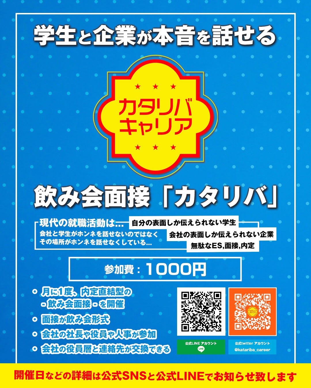・大衆居酒屋でラフな飲み会 ・学生が気になるテーマでトークセッション ・その場でオファーができる裏口入社制度